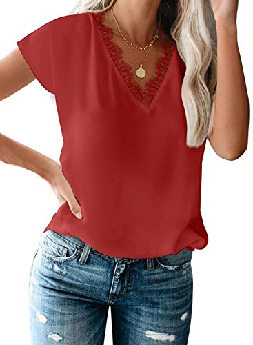 Acelitt Womens Ladies Casual V Neck Lace Short Sleeve Summer Blouse Shirts Tees Tops Clothing 2020 Red Medium