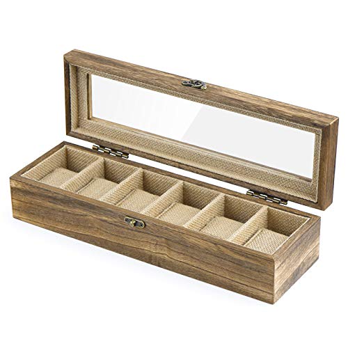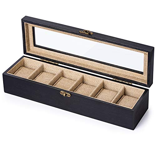 SRIWATANA Watch Box Case Organizer Display for Men Women, 6 Slot Wood Box with Glass Top, Carbonized Black