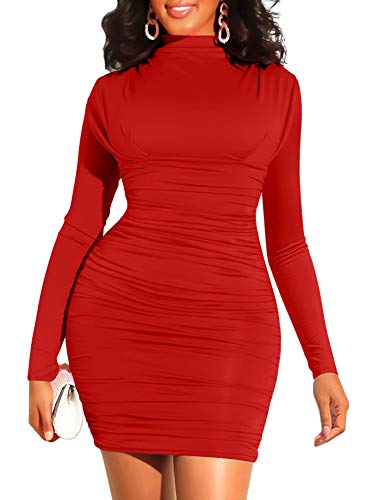 BEAGIMEG Women's Ruched Bodycon Long Sleeve High Neck Casual Mini Dress