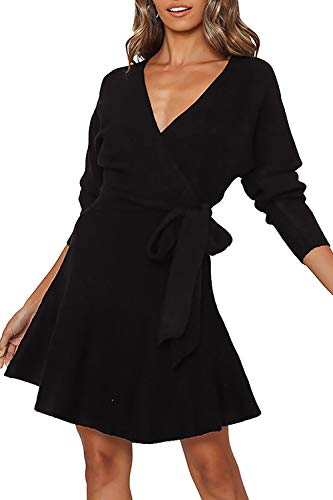 Meenew Women's Mini Sweater Dress Deep V Neck Long Sleeve Tunic Dress Black S