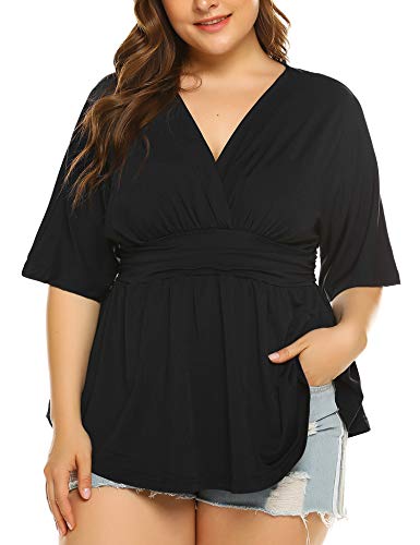IN'VOLAND Womens Plus Size Blouse V Neck Wrap Front Drape Tunic Tops Short Sleeve Pleated Waist Shirt Black