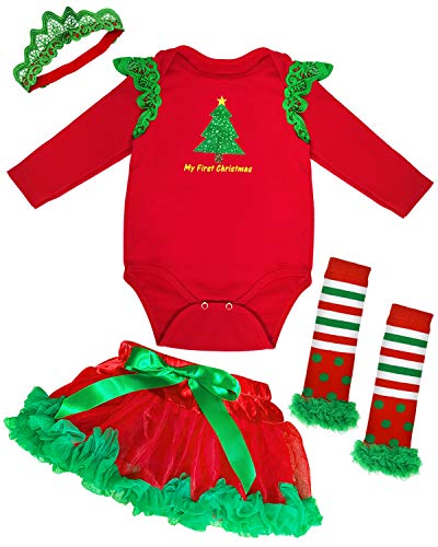 Camlinbo 4Pcs Baby Girl My First Christmas Tutu Dress Outfit Cloth Infant Newborn Romper Headband Leg Warmers 0-14M