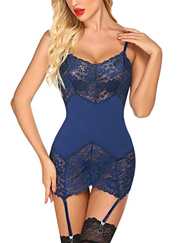 ADOME Sexy Lingerie Set for Women Lace Teddy Badydoll with Garter Belt Full Slip Bodysuit No Stockings Navy Blue XXL
