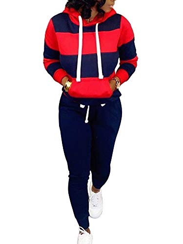 Xibulin Women 2 Piece Outfit Long Sleeve Hoodie Kangaroo Pocket Stripe Pullover Sweatshirt Skinny Pants Tracksuit Set