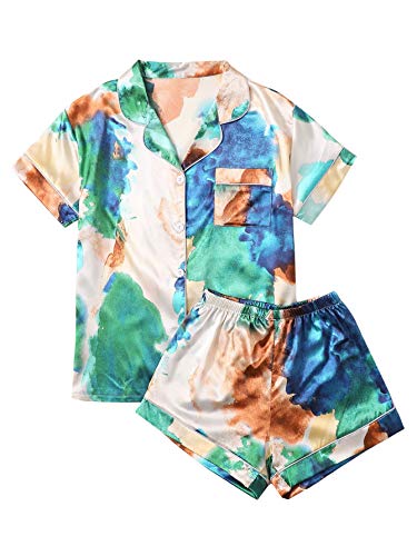 SOLY HUX Women's Tie Dye Short Sleeve Sleepwear Button Down Satin 2 Piece Pajama Set