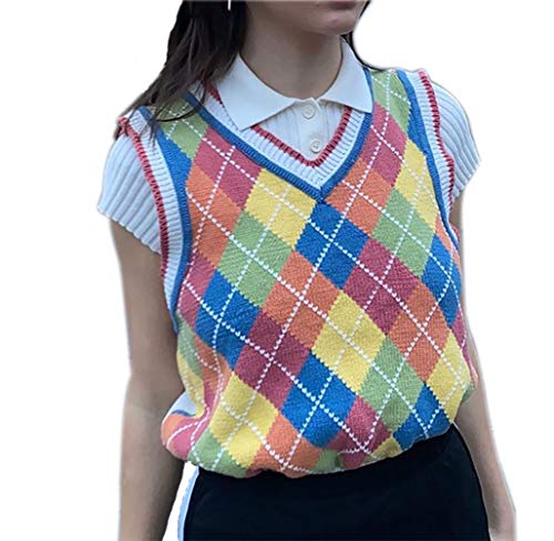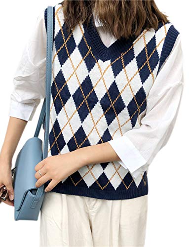 Meladyan Women’s Argyle Geo Plaid Knitted Sweater Vest V Neck 90s E-Girls Preppy England Style Knitwear Tank Tops